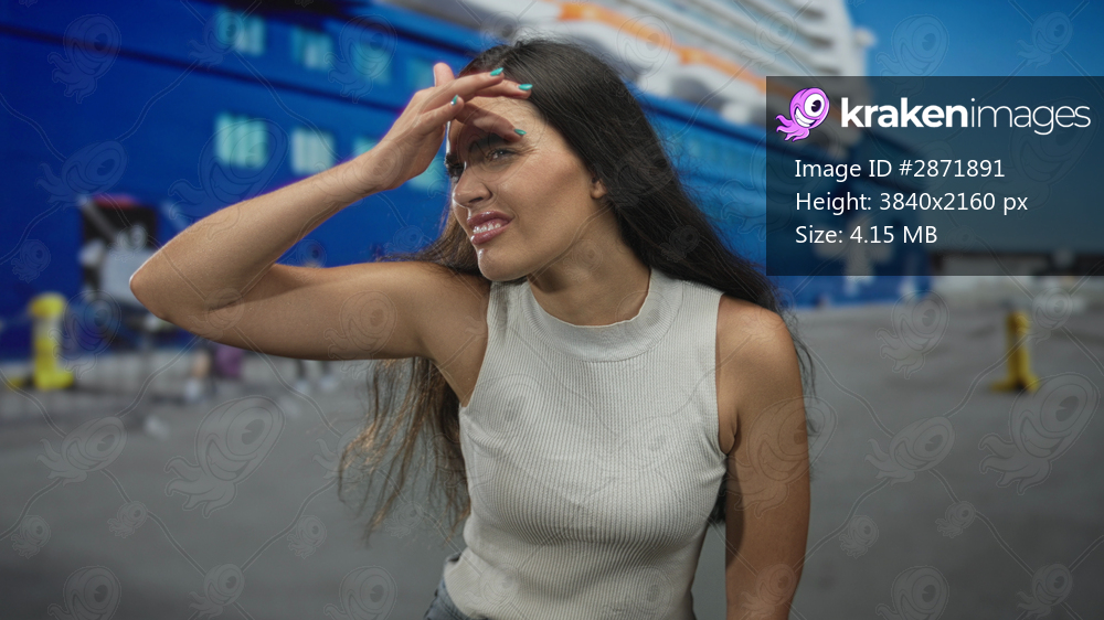 Woman shielding eyes with hand to forehead beside a cruise boat at a street pier, squinting toward the horizon; searching concern.
