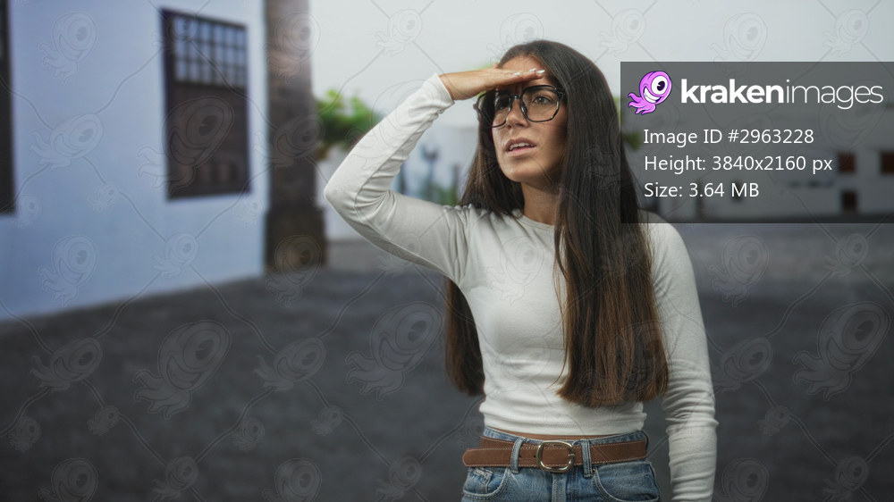 Woman shielding eyes with hand to forehead and wearing glasses on a sunlit street near white building; curiosity.