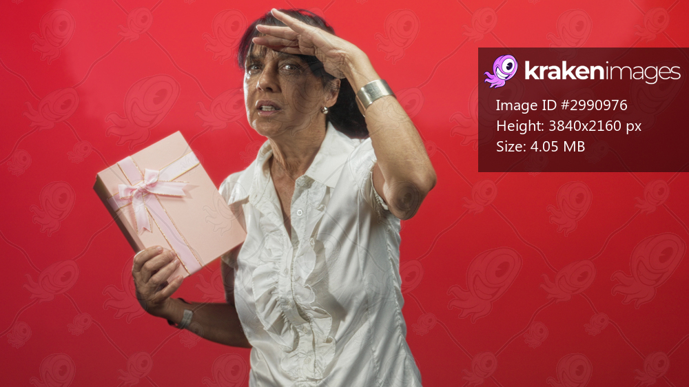 Woman shielding eyes with hand while holding pink gift box to inspect present in studio; anticipation memory.