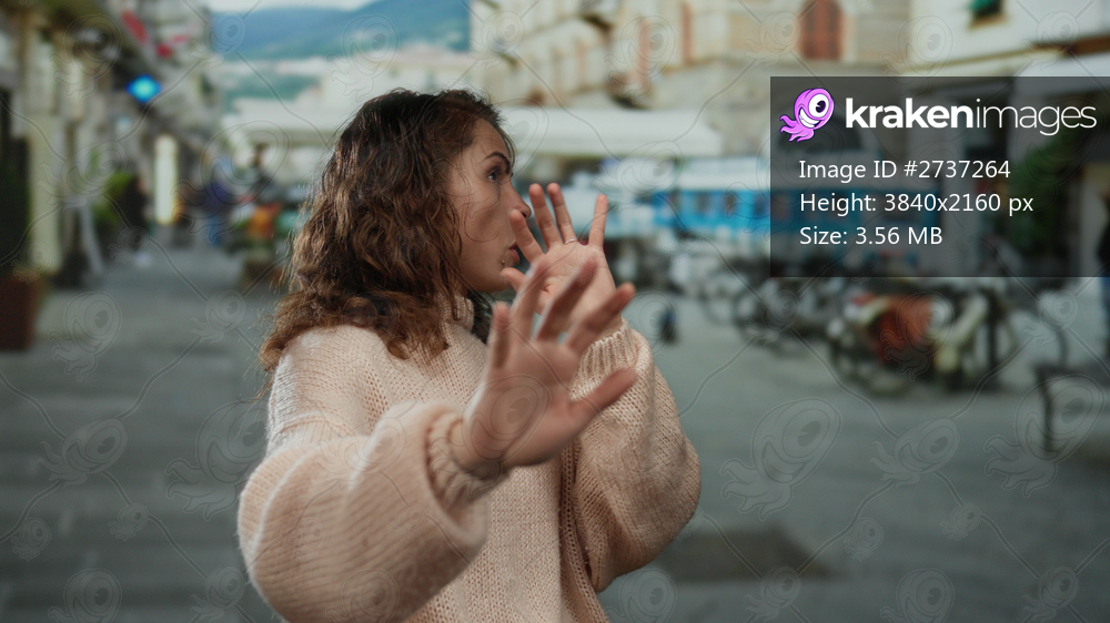 Woman shielding eyes on city street appears distressed with urban landscape in background suggesting bright sunlight or unexpected event.