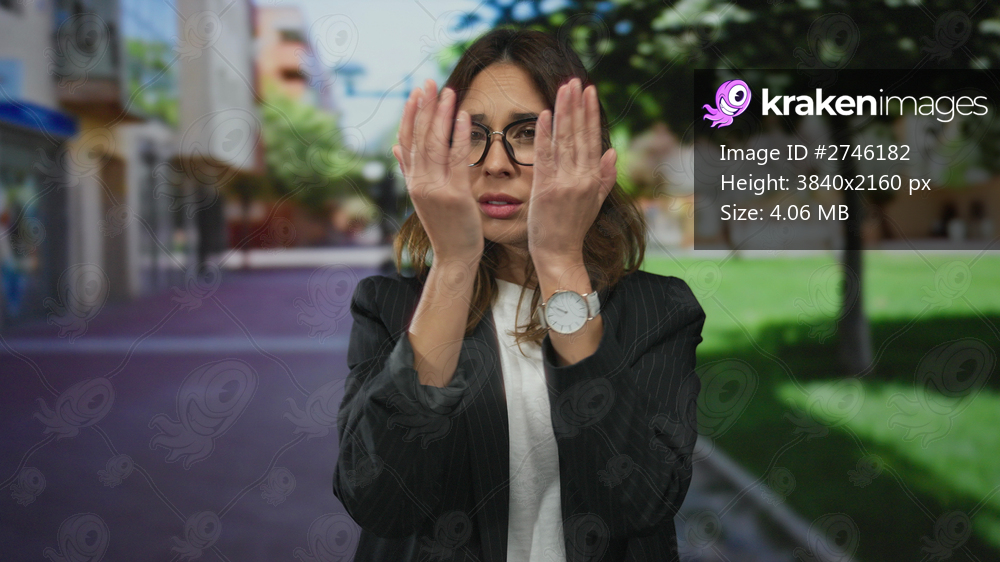 Woman shielding face with hands in an outdoor city street scene with greenscape symbolizing privacy and discomfort.