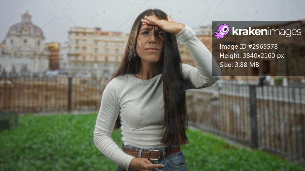 Woman shielding forehead with hand and exposed face, standing by a historic building and stone ruins with fence and lawn; travel frustration.