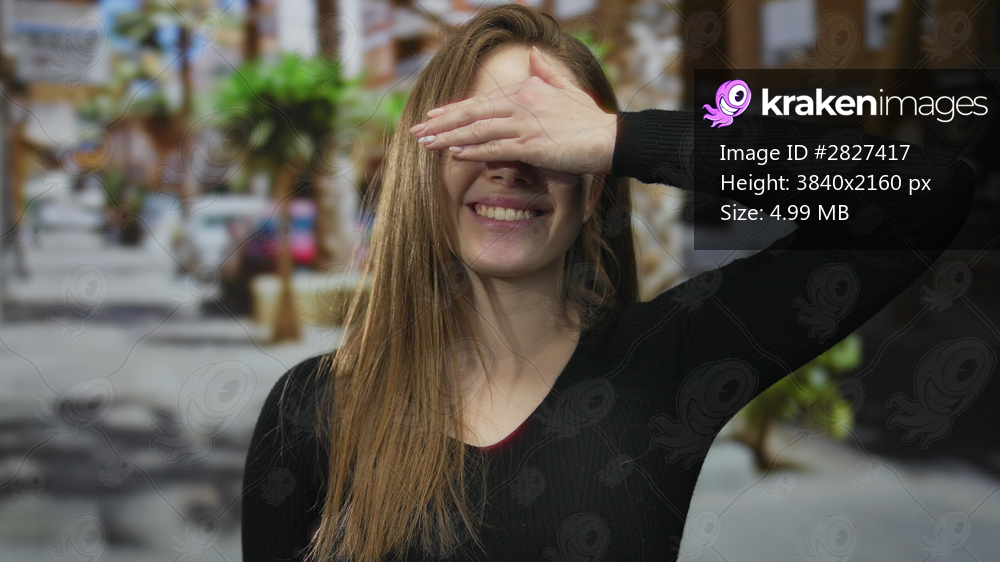Woman shields eyes with hand on sunlit urban street in downtown setting lined with shops and blurred cars; playfulness.