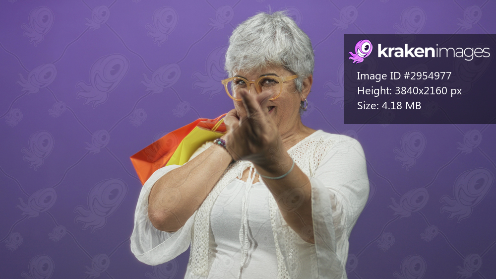 Woman with shopping bag over shoulder beckons with hand toward camera in studio against purple backdrop; joyful confidence.