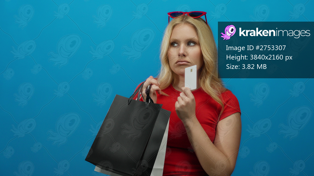 Woman shopping with bags and credit card against a blue background, wearing red clothes and sunglasses, looking thoughtful about purchase decision, young and blonde. - Kraken Images