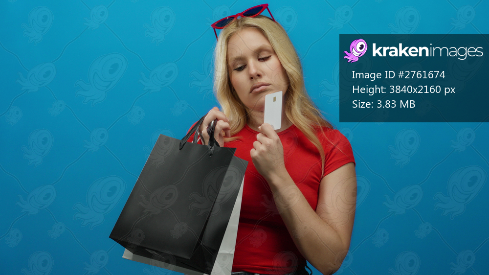 Woman shopping with bags and credit card against a blue background, wearing red clothes and sunglasses, looking thoughtful about purchase decision, young and blonde. - Kraken Images