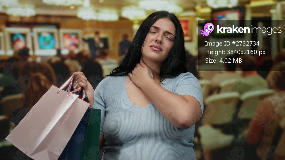 Woman with shopping bags in an art gallery with a pained expression, surrounded by people indoors, reflecting financial or emotional stress.