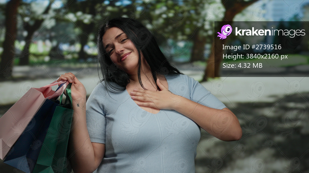 Woman shopping happily in an outdoor park setting with colorful bags while enjoying a sunny day and embracing her curvy style.