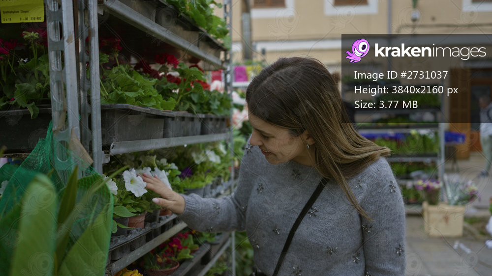 Woman shopping in a vibrant plant market, smiling while selecting flowers with care, creating a lively atmosphere with her youthful presence enhancing the engaging outdoor market scene. - Kraken Images