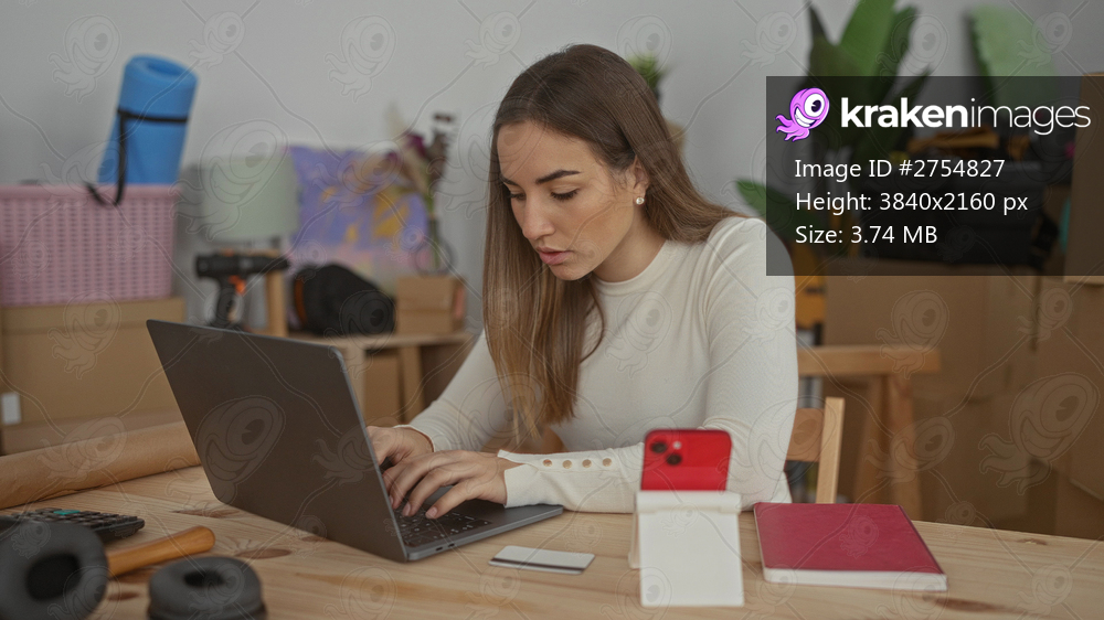 Woman shopping online in new home using laptop and credit card surrounded by moving boxes and a smartphone on desk.