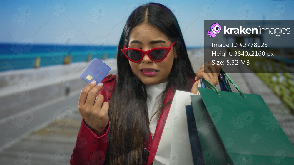Woman shopping seaside promenade holding bags and credit card looks worried while enjoying outdoor beach setting.