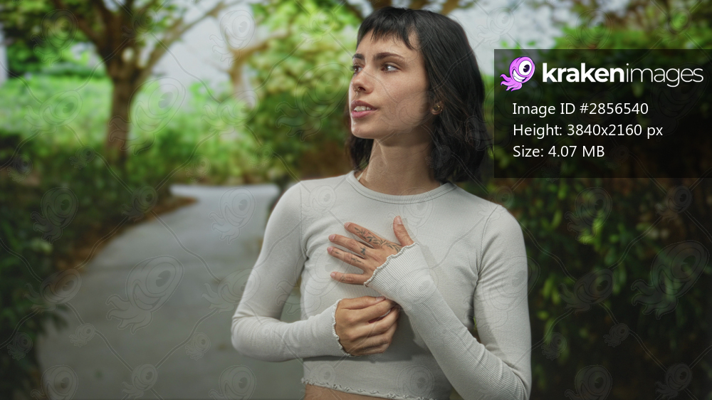 Woman with short black hair wearing white long sleeve top touching neck in green forest while closing her eyes; contemplation.