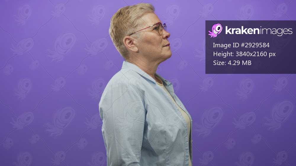 Woman with short blond hair and glasses in profile looking upward in purple studio, wearing light blue button shirt and round frames; quiet contemplation. - Kraken Images