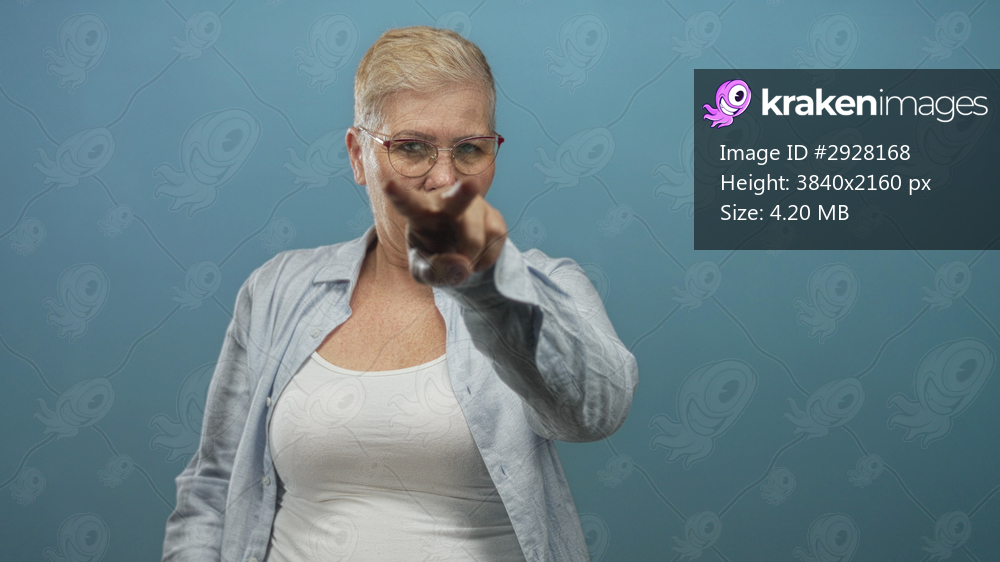 Woman with short blonde hair and glasses pointing finger directly at camera in blue studio; confidence empowerment.