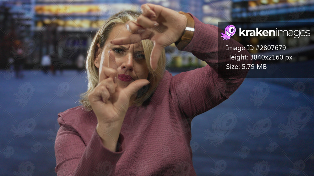Woman with short blonde hair wearing purple sweater framing face with hands in street; creative confidence.