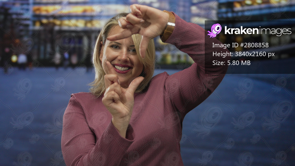 Woman with short blonde hair wearing purple sweater framing face with hands in street; creative confidence.