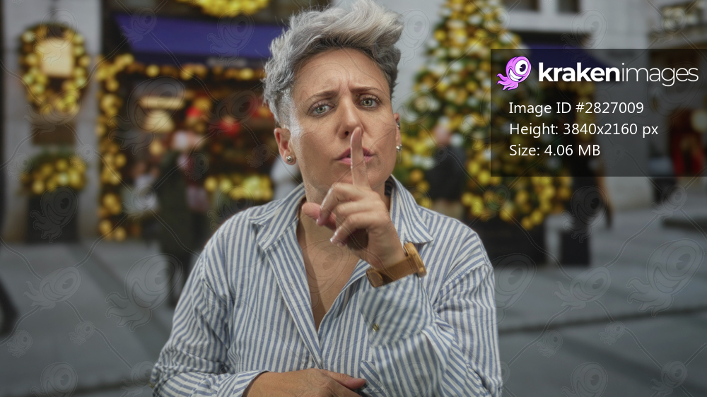 Woman with short gray hair and striped shirt pointing finger on street in front of christmas tree; skepticism.