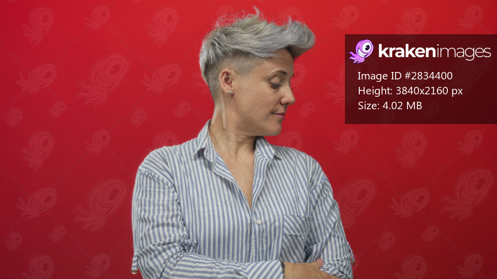 Woman with short gray hair wearing a striped shirt and ear piercings with arms crossed in a red studio; calm denial.