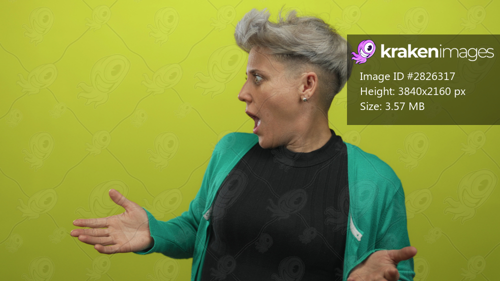 Woman with short gray hair wearing black top and teal cardigan shrugging with open hands in studio; surprise.