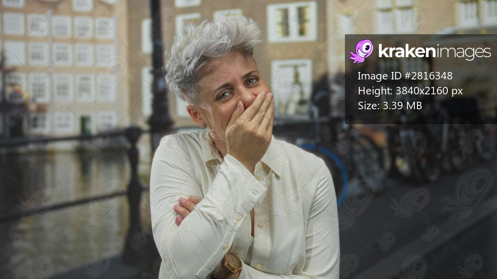 Woman with short gray hair and white shirt covers mouth with her hand on a street by a canal and parked bicycles; amusement joy laughter delight.