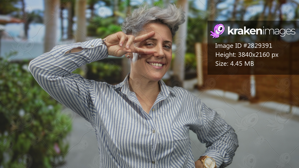 Woman with short grey hair making peace sign with hand at building entrance outdoors in casual striped shirt; fun.