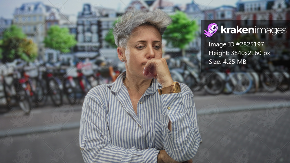 Woman with short grey hair resting hand on chin against bike rental parking on urban street; contemplation.