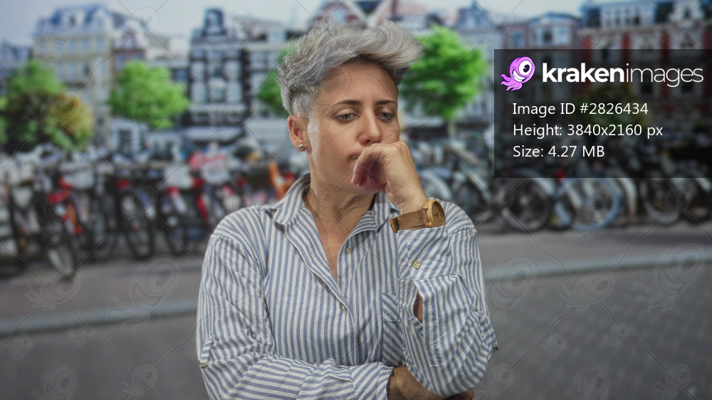Woman with short grey hair resting hand on chin against bike rental parking on urban street; contemplation.