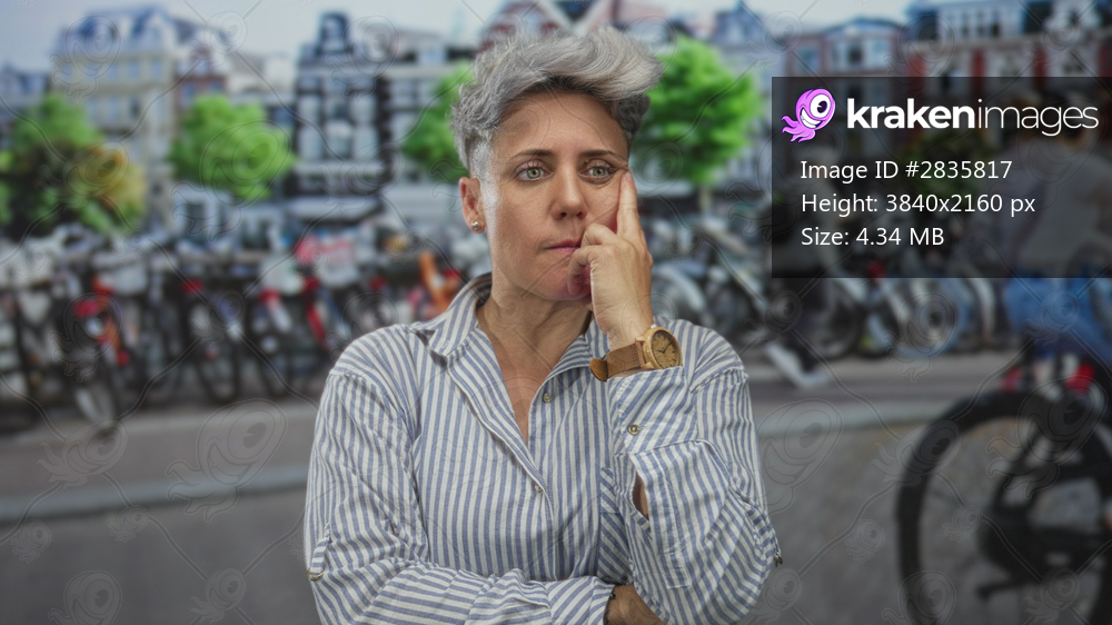 Woman with short grey hair resting hand on chin against bike rental parking on urban street; contemplation.