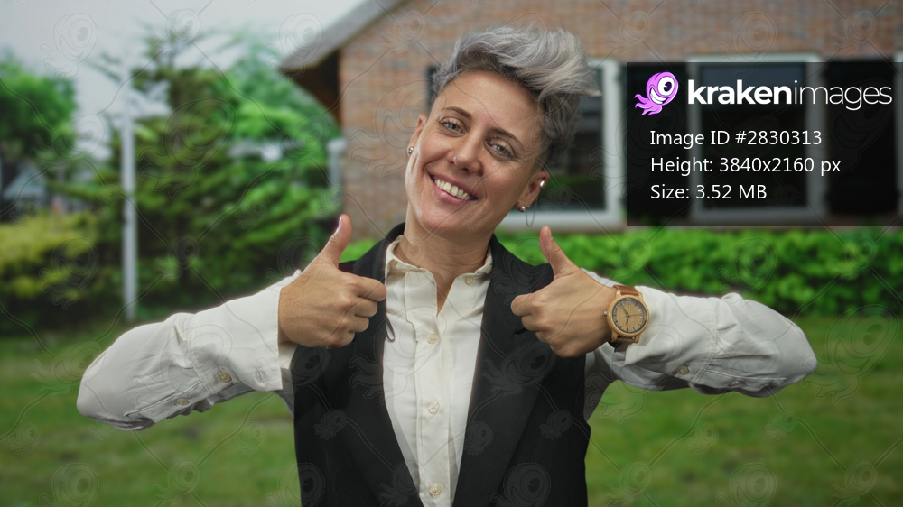 Woman with short grey hair wearing black vest gives two thumbs up at brick building entrance outdoors; approval support encouragement confidence.