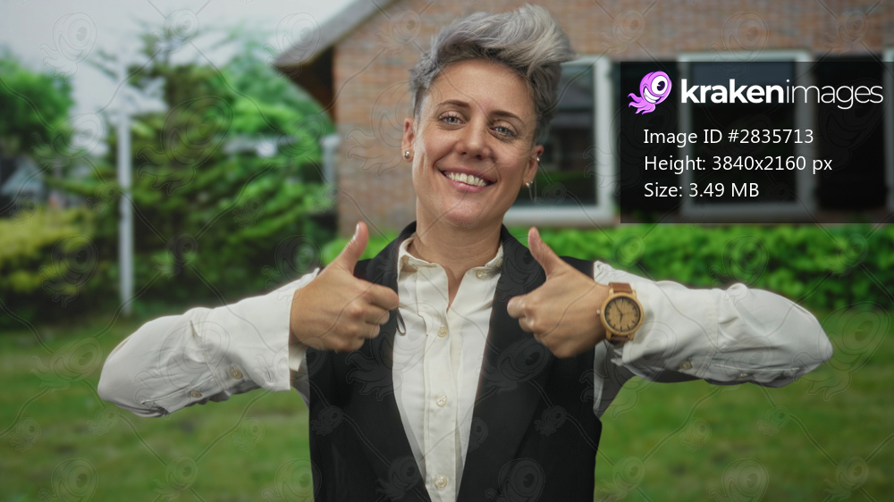 Woman with short grey hair wearing black vest gives two thumbs up at brick building entrance outdoors; approval support encouragement confidence.