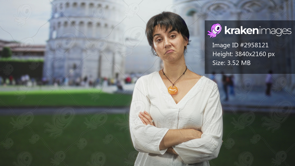 Woman with short hair, arms crossed wearing orange pendant necklace near the leaning tower building; skepticism travel.