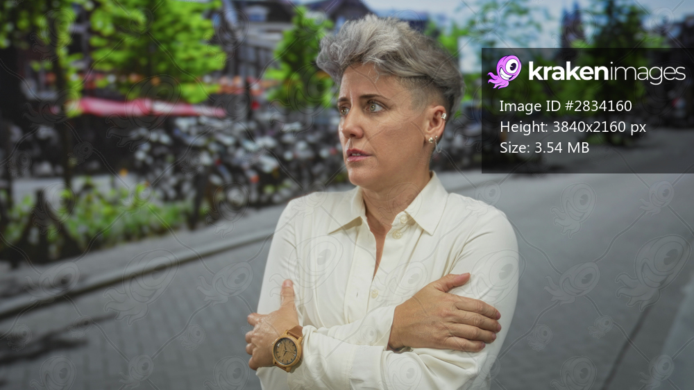 Woman with short hair clasping hands and closing eyes on a sunlit city street, wearing white shirt; serenity.