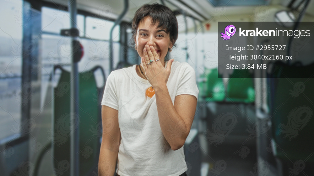 Woman with short hair covering mouth with hand, wearing rings and an orange pendant on a white t shirt inside a bus on street, smiling broadly; surprise. - Kraken Images
