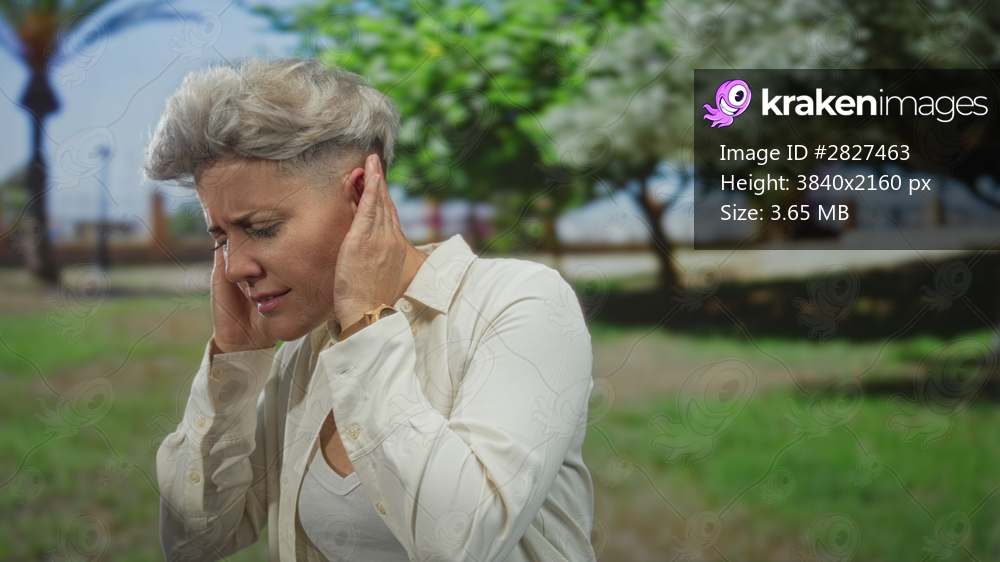 Woman with short hair covers ears under flowering tree in green park wearing white shirt at midday; annoyance.