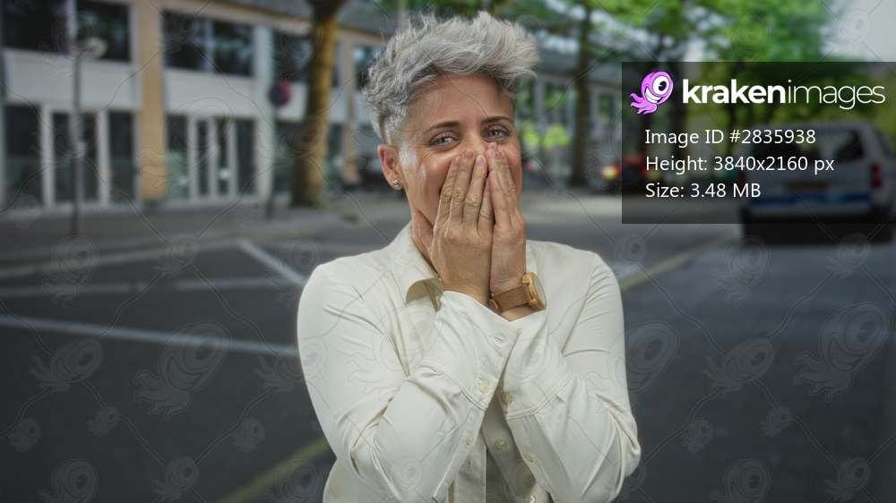 Woman with short hair covers mouth with hands and smiles shyly on city street wearing white shirt; surprise.