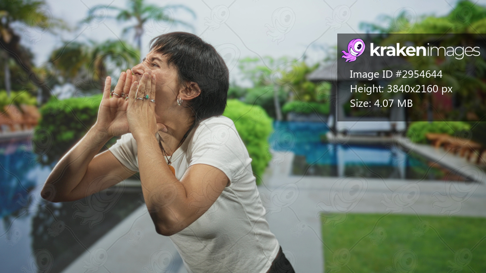 Woman with short hair cupping hands to mouth and shouting toward camera in a studio pool backdrop; joy celebration.