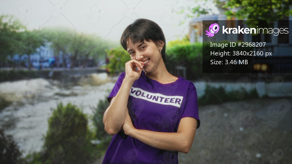 Woman with short hair, hand to chin and arm folded, smiling in a purple volunteer t shirt by a canal with greenery and buildings in a city riverside; cheerful optimism. - Kraken Images