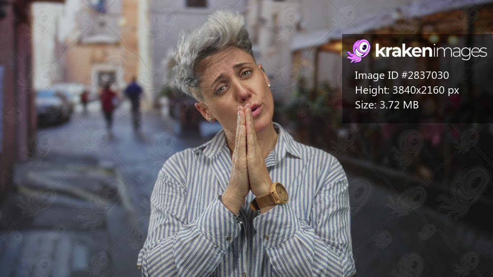 Woman with short hair and hands clasped in prayer on street side restaurant terrace wearing striped shirt and wooden watch; hope.