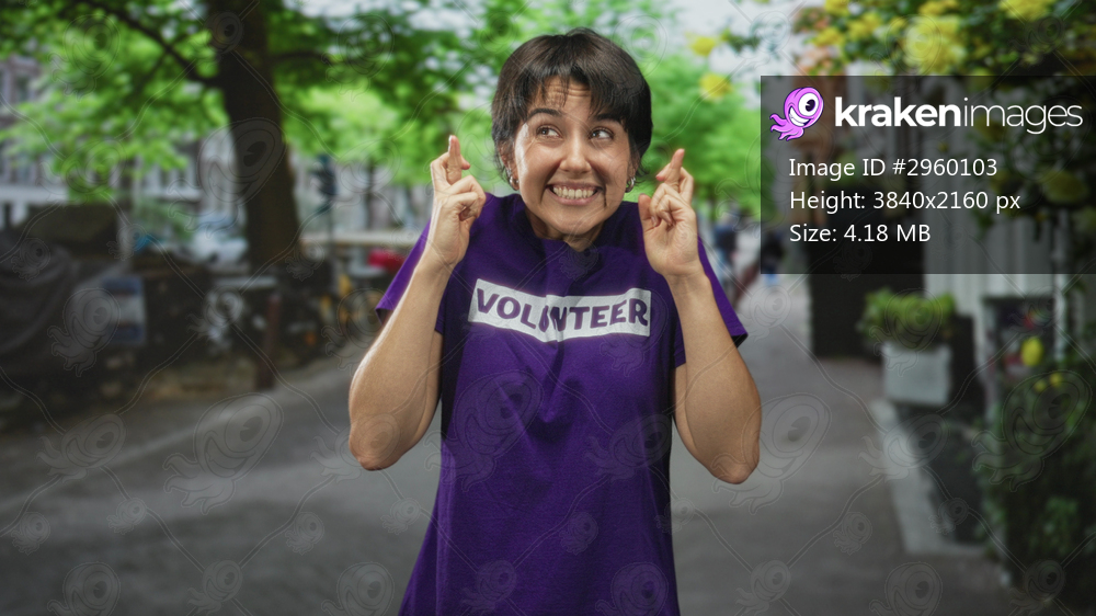 Woman with short hair, hands crossed over chest on a street wearing purple volunteer tshirt, eyes closed and smiling softly in an urban neighborhood; gratitude. - Kraken Images