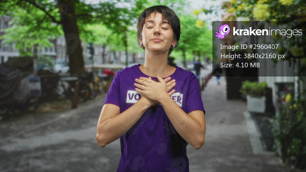 Woman with short hair, hands crossed over chest on a street wearing purple volunteer tshirt, eyes closed and smiling softly in an urban neighborhood; gratitude. - Kraken Images