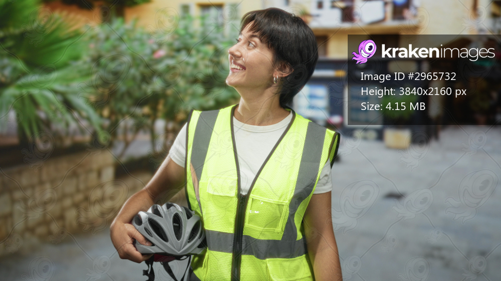 Woman with short hair holding a bicycle helmet at her side and smiling, wearing a yellow reflective safety vest and white tshirt on a street; cheerful confidence. - Kraken Images