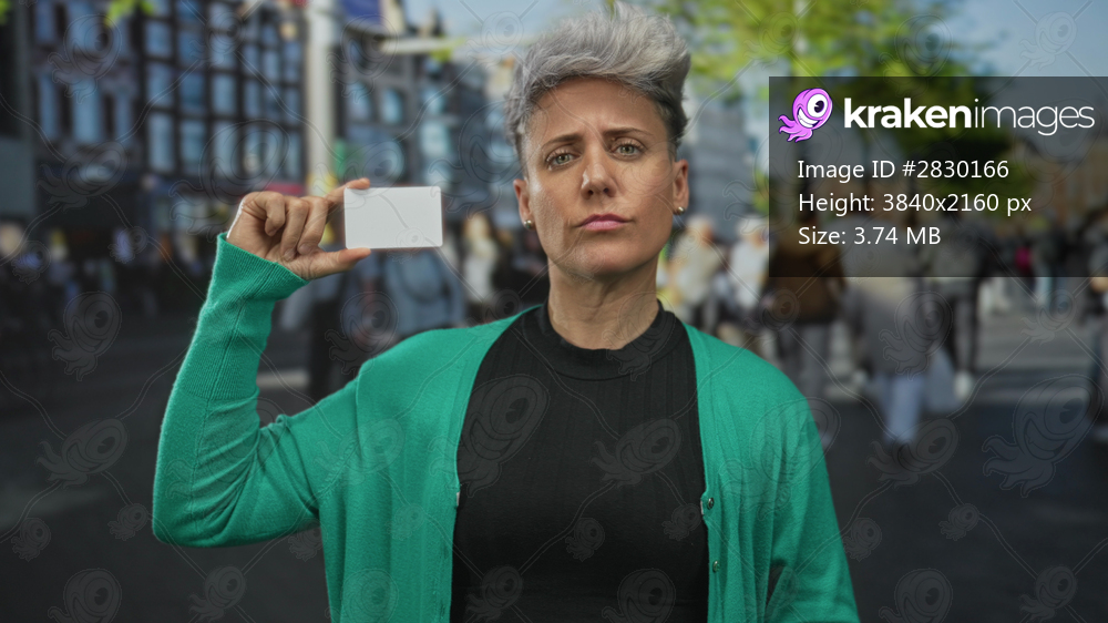 Woman with short hair holds a blank card between fingertips at chest level on urban street amidst blurred crowd; confidence.