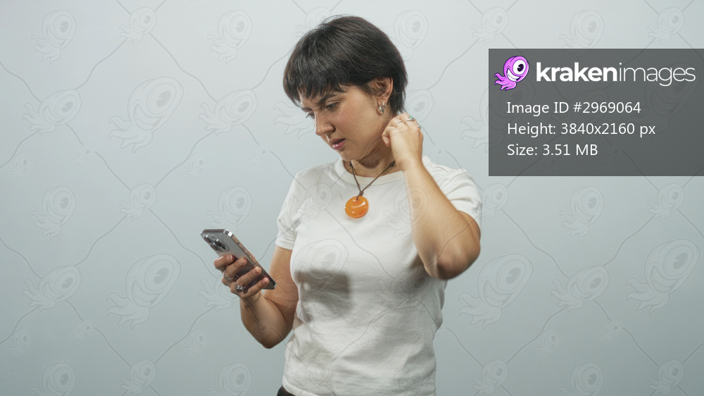 Woman with short hair holds smartphone, touching neck with one hand and reading message while slightly frowning in studio; quiet concern.