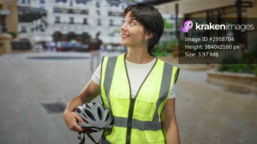 Woman with short hair in a neon reflective vest holds a bicycle helmet, smiles and looks up in a street plaza; urban commuting confidence.