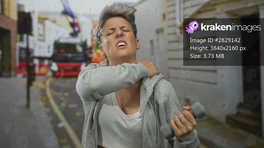 Woman with short hair in gray hoodie lifts dumbbell on city street near a fire truck with a tense grimace; pain.