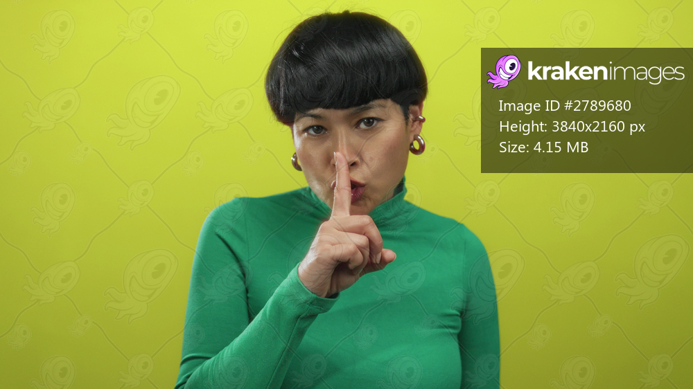 Woman with short hair in green top gesturing silence over vibrant yellow background expressing secrecy focus.
