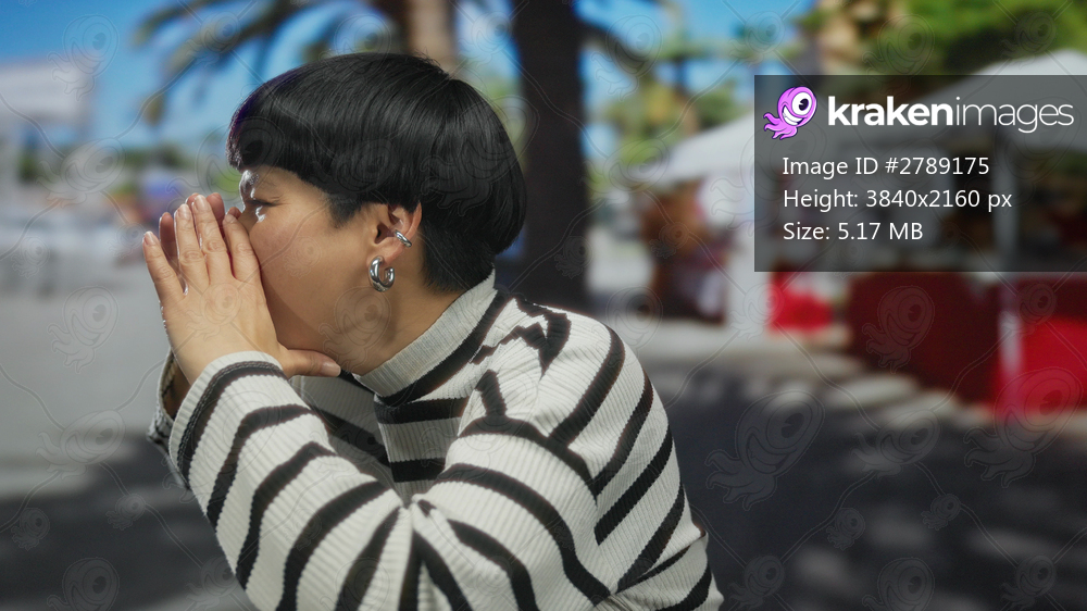 Woman with short hair in striped sweater gestures with both hands in a city street scene, expressing confusion under sunny skies by outdoor market.