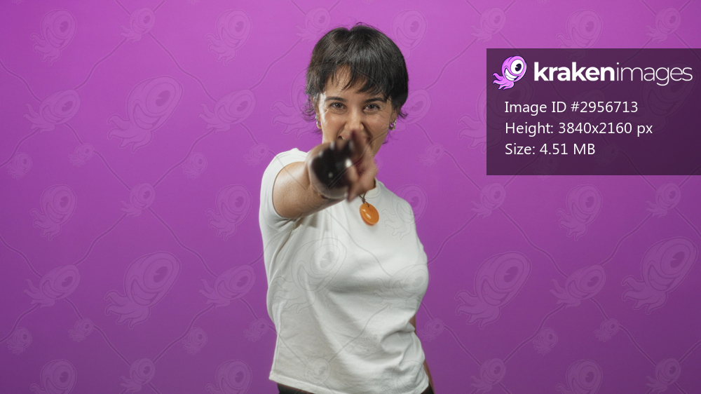 Woman with short hair in white t shirt pointing finger at camera in purple studio wearing orange pendant; joyful moment.