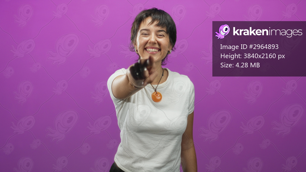 Woman with short hair in white t shirt pointing finger at camera in purple studio wearing orange pendant; joyful moment.
