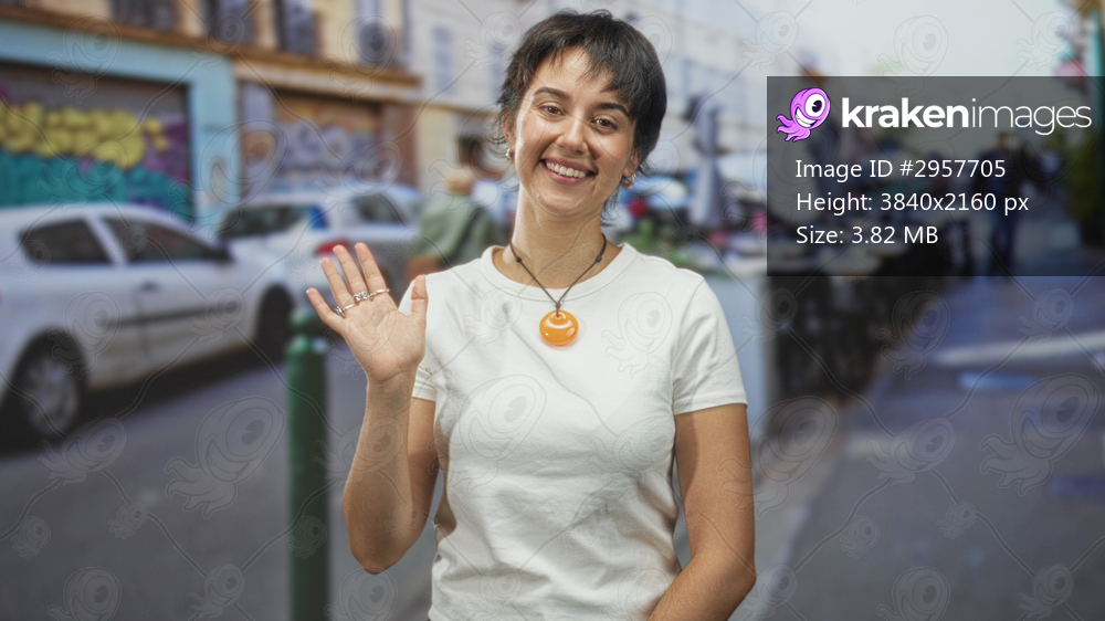 Woman with short hair in white tshirt and orange pendant waves hand on a busy street cafe sidewalk while smiling; casual greeting friendly.